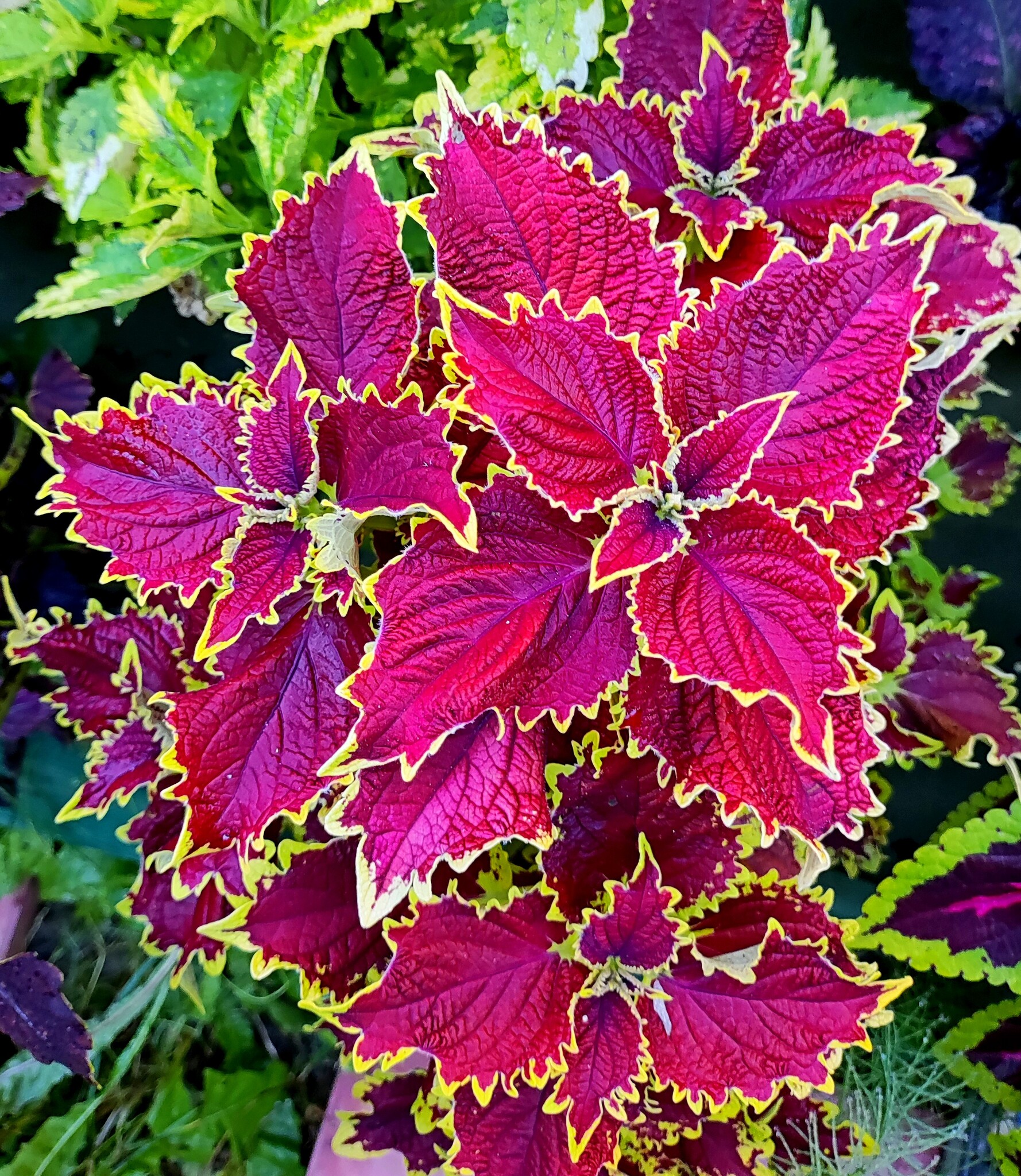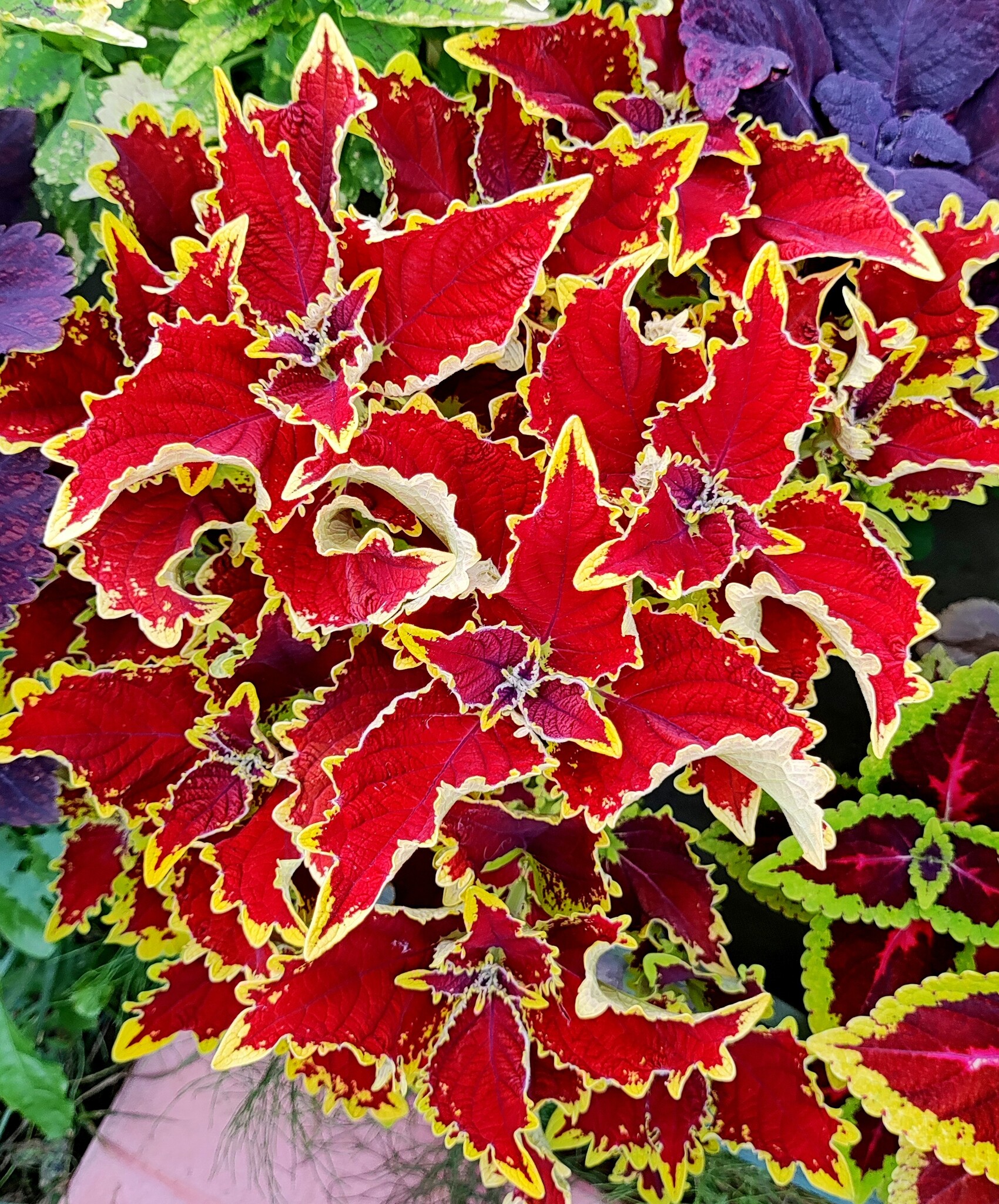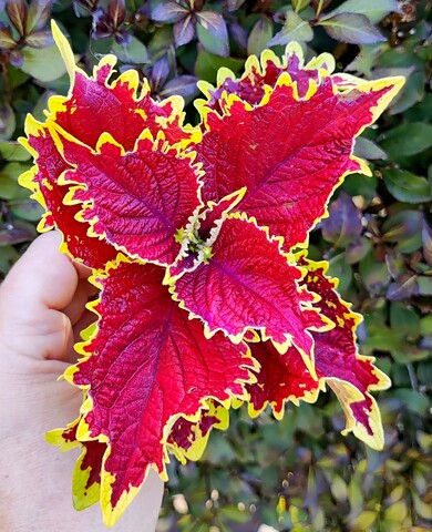 Широкие темно-красные листья с ярко-золотым краем, петельчатый и уникальный.